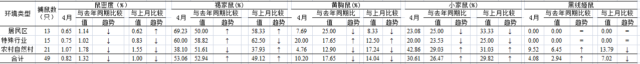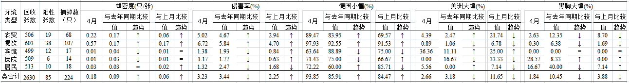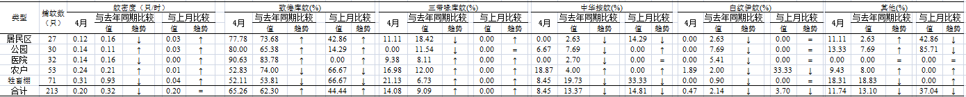 2015年4月份气温逐步升高,蚊和蝇的繁殖和活动开始加强。根据本月监测结果显示,与上月相比,鼠类监测密度有所下降,蟑的监测密度有所上升,蚊蝇监测密度均与上月持平。四月份气温处于逐步上升的过程,平均温度升高,利于蚊类、蝇类的繁殖,全省蚊、蝇密度也会逐渐增高。