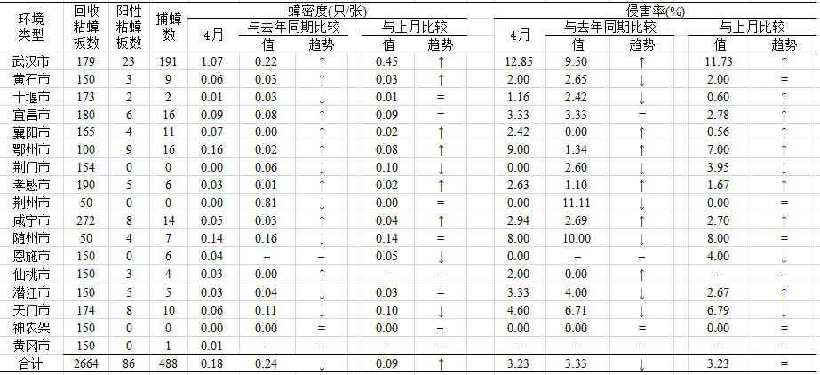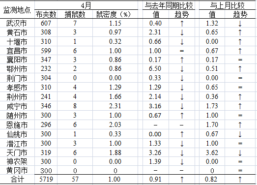 本月鼠密度监测结果显示,咸宁市最高(2.31%),其次是天门市(1.81%)。本月与去年同期及上月各市(州)鼠密度监测结果比较情况见表5。