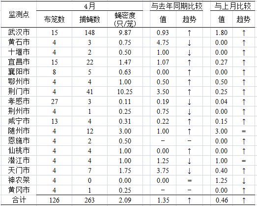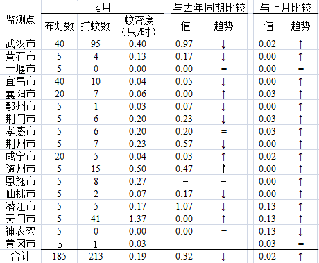 为保证湖北省病媒生物监测工作的顺利开展,有效应对各种虫媒传染病的发生和流行,按照《湖北省病媒生物监测方案》(2013版)要求,全省17个市州开设了病媒生物监测点,已经逐渐开展了病媒生物监测。现将湖北省2015年4月各市(州)开展病媒生物监测情况汇报如下: