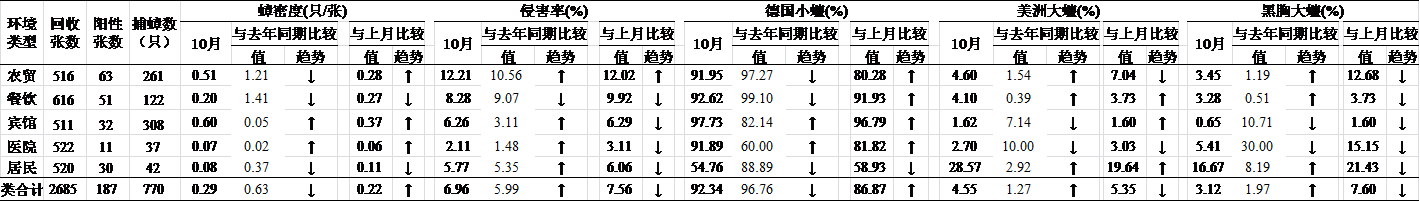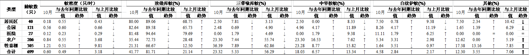 10月份全省气温明显下降,气候条件非常不利于蚊、蝇等病媒生物的繁殖。经分析本月鼠、蚊、蝇等病媒生物密度与上月相比均有所下降,尤其是蚊密度下降非常明显,但蟑螂密度略有升高,因此病媒防制工作仍然不能松懈。各地区应根据当地实际情况,有针对性的开展环境清理,加强灭鼠、灭蟑,降低与其相关媒介传染病的发生。