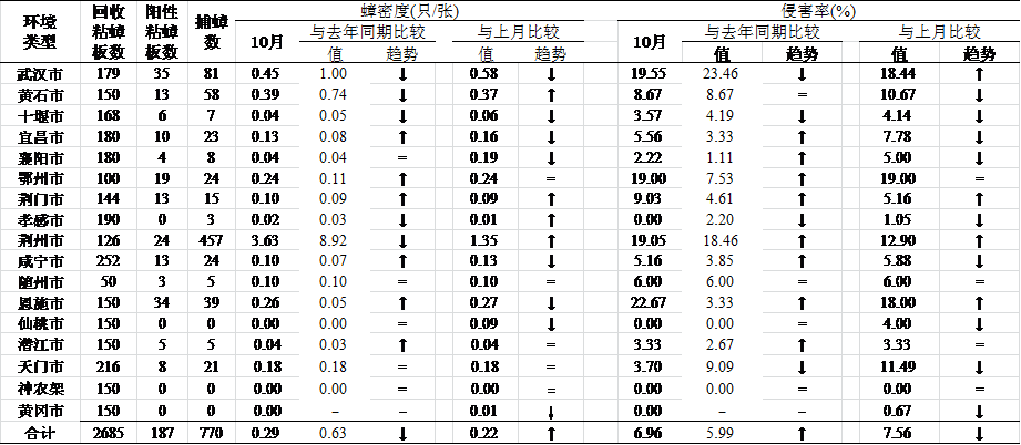 本月蟑密度监测结果显示,荆州市最高(3.63只/张),其次是武汉市(0.45只/张);侵害率监测中,恩施州最高22.67%,其次是武汉市19.55%。本月与去年同期及上月各市(州)蟑密度和蟑侵害率监测结果比较情况见表8。