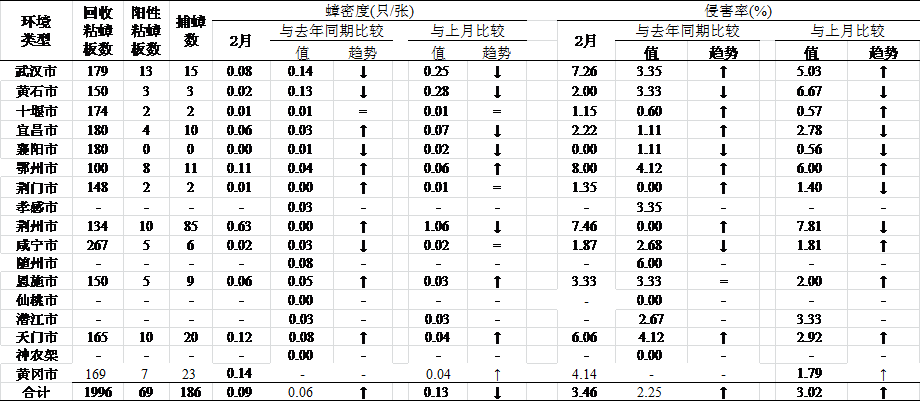 受春节假日的影响,本月部分市(州)病媒生物监测工作人员积极性有所下降,导致部分市(州)病媒生物监测数据未能及时上报。望各地调节好监测工作与节假日时间节点,按期完成监测工作并及时上报。