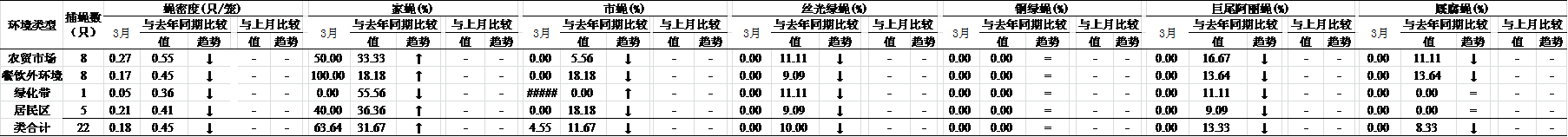 本月病媒生物监测结果显示,全省鼠平均密度为1.27%,与上月及去年同期相比均有所升高;所捕获鼠以小家鼠为主。全省蟑平均密度为0.14只/张,平均侵害率4.92%,与上月及去年同期相比均有所升高;所捕获蟑以德国小蠊为主。3月全省开始本年度首次蚊、蝇密度监测,当月监测蚊平均密度为0.08只/灯•时,与去年同期相比有所下降,所捕获蚊以致倦库蚊为主;蝇平均密度为0.18只/笼,与去年同期相比有所下降,所捕获蝇以家蝇为主。