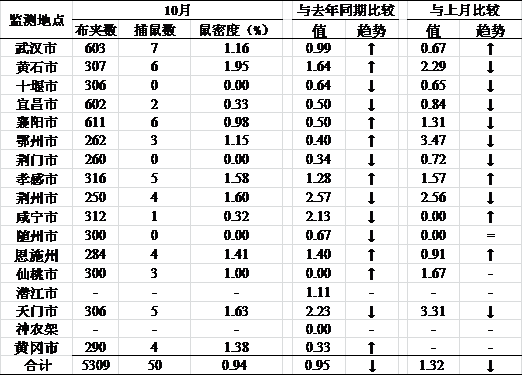 表5 2016年10月湖北省各市(州)病媒生物监测结果—鼠密度