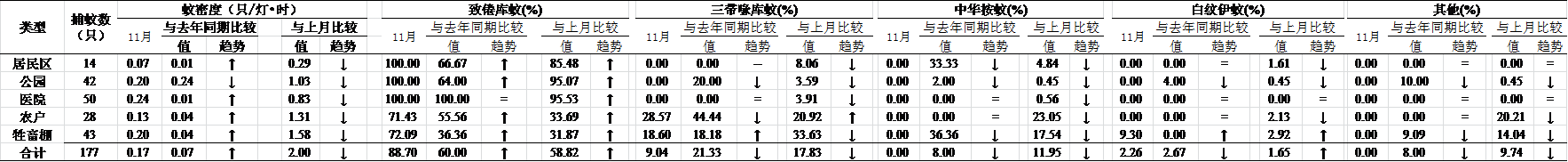 表2 2016年11月不同监测环境的蚊密度及种群构成情况比较