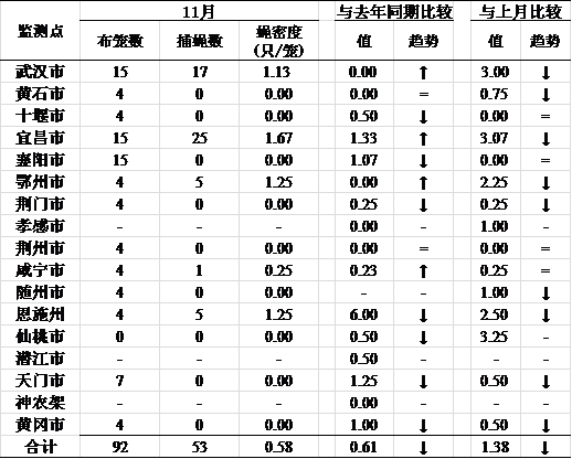 为保证湖北省病媒生物监测工作的顺利开展,有效应对各种虫媒传染病的发生和流行,按照《湖北省病媒生物监测方案》(2013版)要求,全省17个市州开设病媒生物监测点,现将湖北省2016年11月各市(州)开展病媒生物监测情况汇报如下: