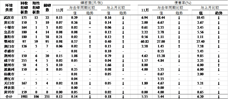 本月蟑密度监测结果显示,鄂州市最高(0.98只/张),其次是襄阳市;侵害率监测中,鄂州市最高60.82%,其次是随州市。本月与去年同期及上月各市(州)蟑密度和蟑侵害率监测结果比较情况见表4。
