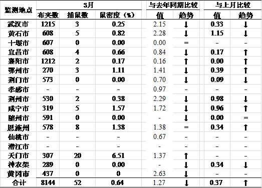 表3 2017年3月湖北省各市(州)病媒生物监测结果—鼠密度