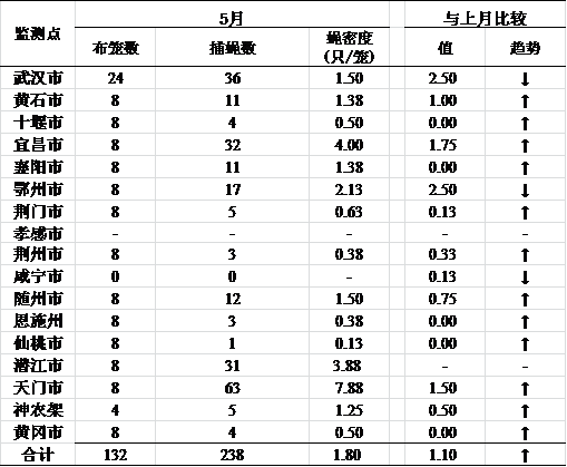 根据《湖北省病媒生物监测方案》(2017版)规定,蚊、蝇的密度监测方法及计算公式与《湖北省病媒生物监测方案》(2013版)有所变动,故本年度的蚊密度、蝇密度的监测数据无法与去年同期进行比较。