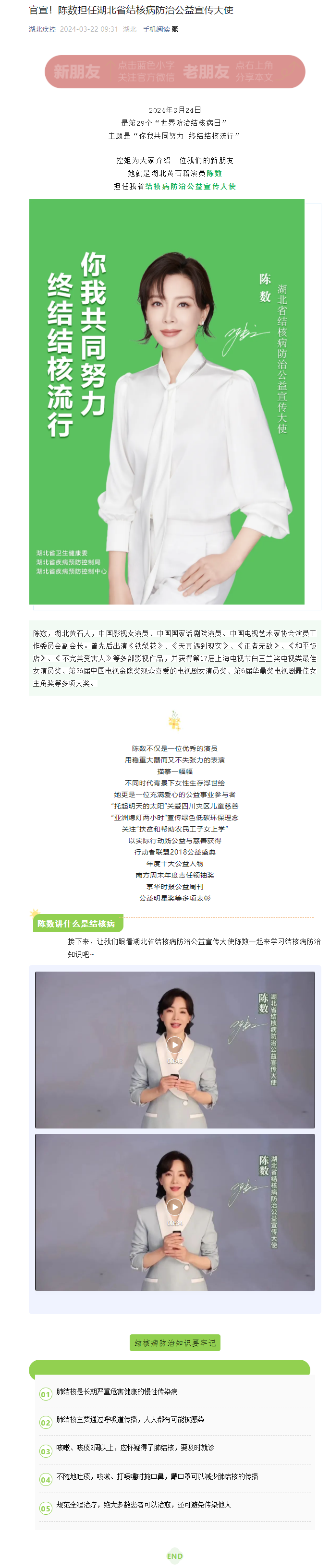 官宣!陈数担任湖北省结核病防治公益宣传大使