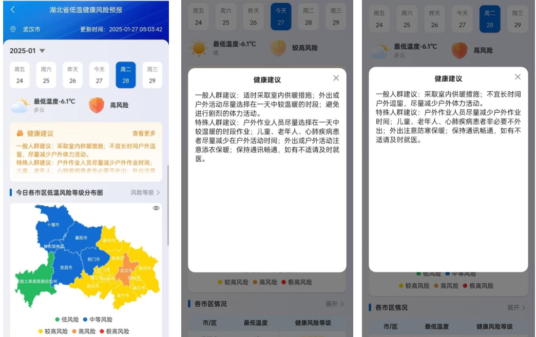 湖北省低温寒潮健康风险预报为湖北省环境健康风险预报发布平台三大功能之一,可展示我省当日及未来2日的最低温度,提示对应的低温健康风险等级和健康防护建议,其信息展示在空间尺度上可精确至17个地市州的每个区县。对于不同的天气情况,低温健康风险等级共分为“低风险、中等风险、较高风险、高风险、极高风险”5个等级,每个等级所匹配的健康防护建议可以帮助公众提前做好应对和健康防护,达到降低健康损失的目的。该平台自2024年12月17日正式上线以来,已连续发布低温健康风险信息40余天,并将持续发布。