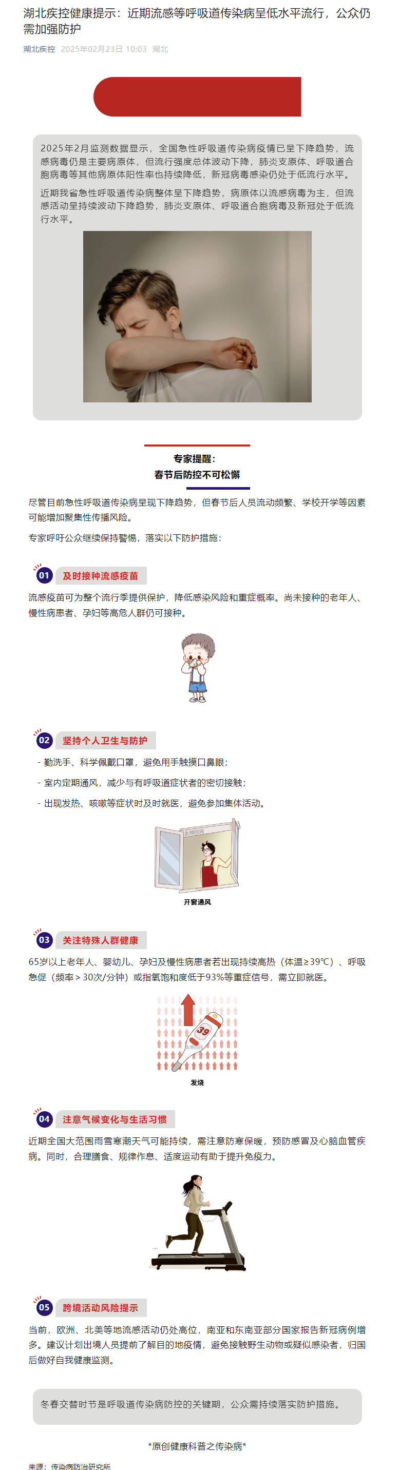 湖北疾控健康提示:近期流感等呼吸道传染病呈低水平流行,公众仍需加强防护