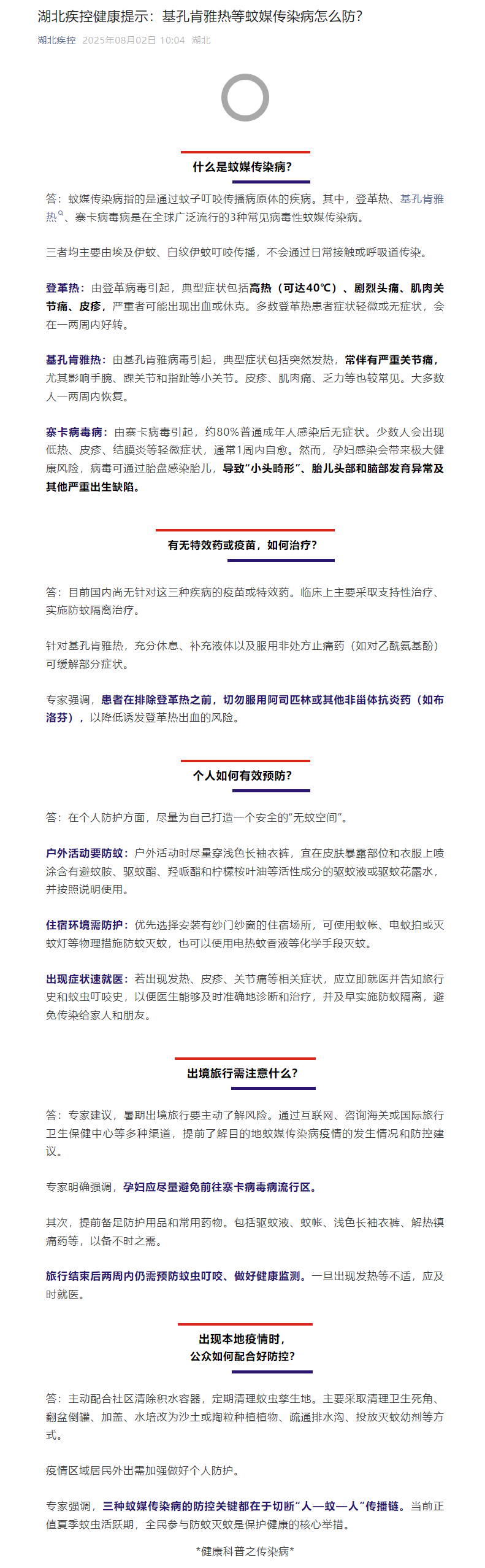 湖北疾控关于预防登革热和基孔肯雅热的健康提示