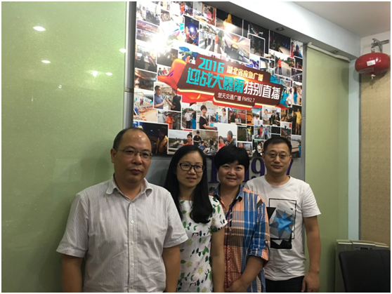 针对我省当前汛情,7月4日晚,楚天交通广播电台FM92.7“社会调查组”栏目制作了“2016湖北应急广播迎战大暴雨特别直播”节目,邀请院中心传防所消杀科张天宝主任和血防所防治部周晓蓉主任赴电台与听众互动,介绍灾区灾民的用水、饮食卫生注意事项、疫区人群如何预防血吸虫病等知识。