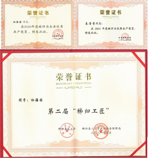 杜海国、秦雪芬被评为优秀共产党员、秭归工匠